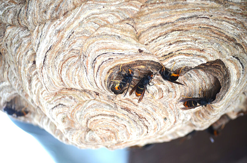 Die Vespa Velutina Nigrithorax (Asiatische Hornisse) baut ihre Nester in zwei Phasen: zuerst ein Primärnest im Frühjahr an geschützten, oft bodennahen Orten wie Schuppen, Hecken, Rollladenkästen, Dachvorsprünge, Gartenlauben, Kaminholzstapel, Keller oder Hohlräumen; diese Nester liegen meist zwischen 1 und 2 Meter Höhe. Später im Jahr, nach dem Schlupf der ersten Arbeiterinnen, folgt oft der Bau eines Sekundärnests, das bevorzugt hoch oben in Baumkronen (meist zwischen 10 und 30 Meter Höhe), an Gebäuden, Hausdächern oder auch weiterhin an geschützten Stellen liegt.